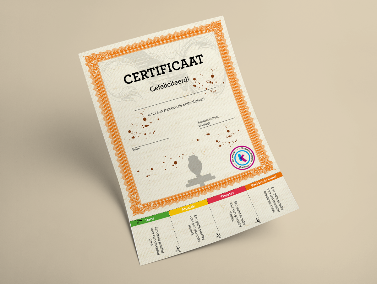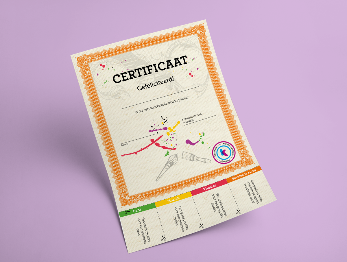 Voor het Kunstencentum in Waalwijk heb ik diverse flyers en certificaten ontwikkeld. Hieronder vind je een voorbeeld van deze uitingen.